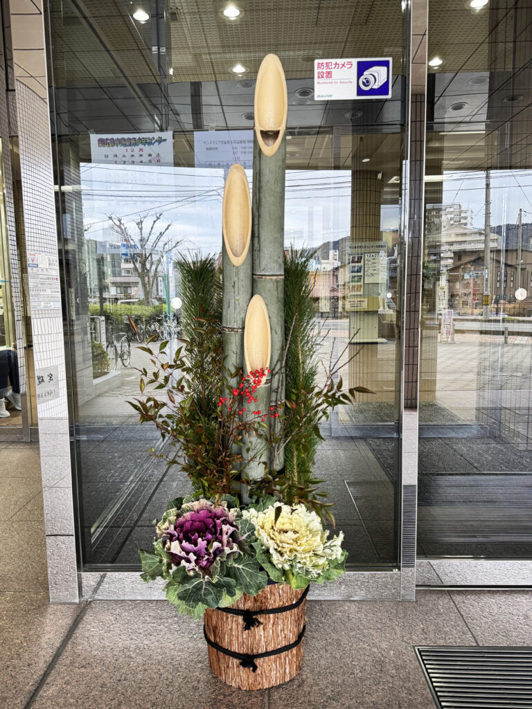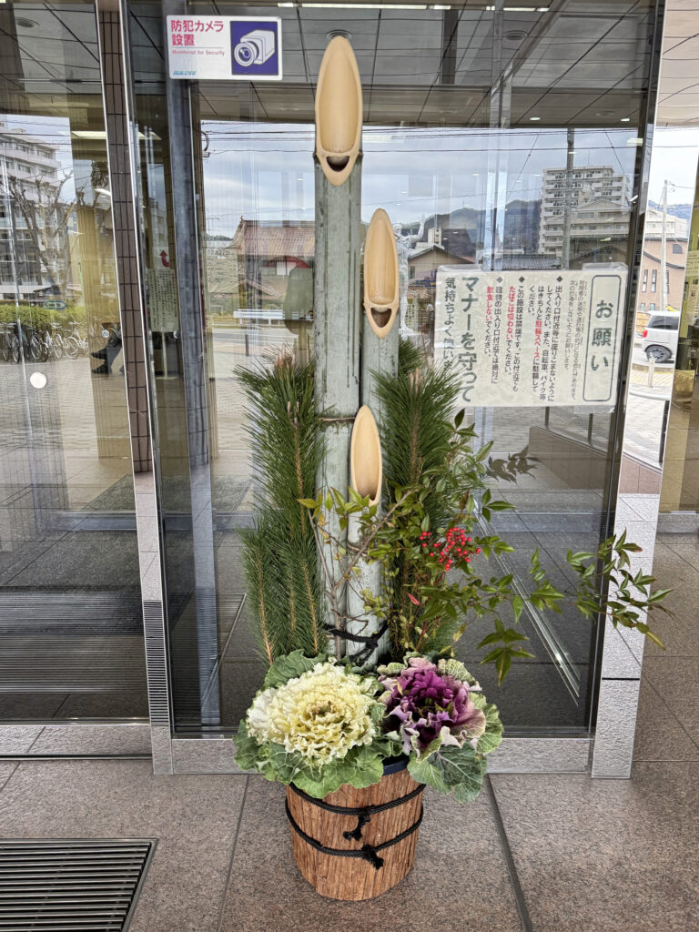 サンスクエア東広島の正面玄関前に、門松としめ飾りを飾りました。